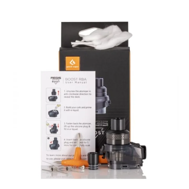 İki post tekli bobin RDTA yapı güvertesi, ayarlanabilir hava akışı kontrol kadranına sahip ve 2 mL'ye kadar en sevdiğiniz eJuice tutabilecek Geek Vape AEGIS BOOST RBA Bobini ile en sevdiğiniz kapsül sistemini değiştirin . Aegis Boost Pod Sistemi için tasarlanan RBA Bobin Güverte, daha büyük ve egzotik bobin yapılarına izin veren ancak güvertenin üzerine inşa edilmesini nispeten kolay tutan kelepçe tarzı sistemde direk başına tek bir açık terminal içerir. Bobin uçlarını üstte sabitlenmiş bir Phillips vida ile sabitleyen BOOST RBA Coil'in açık terminalleri kullanıcının çıkıntılı uçları kesmesine izin verir. Kapsülün duvarları içinde 2 mL'ye kadar çıkan Aegis Boost RBA Bobini, freebase eJuice veya nikotin tuzlarını buharlaştırmak için kullanılabilir, silikon kapamalı üst doldurma sistemi ile doldurulur. Damlama ucu ağızlığının karşısında, iç bobin yapısından geçen hava akımı miktarını ayarlayarak hava akımı kontrol halkası bulunur.