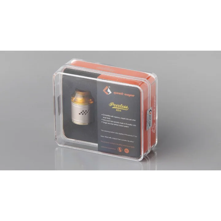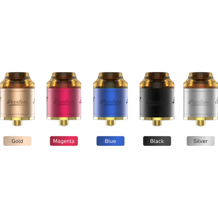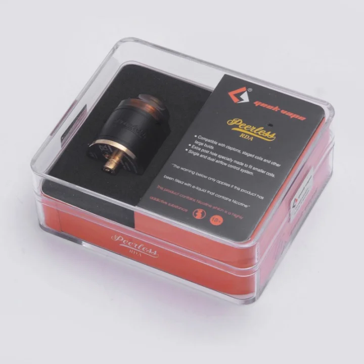 Peerless RDA, küçük coilleri desteklemek için eklenen bir direk delikli büyük yapılara uyacak şekilde yapılmış orijinal bir yapı güverte tasarımına sahiptir. Ayrıca Squonk MOD için bir kalem pin ile birlikte gelir.